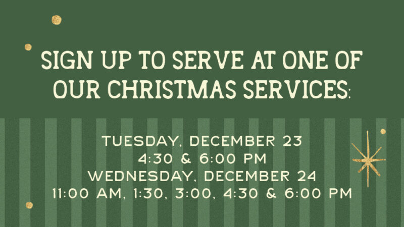 Help us welcome our community this Christmas! Sign up to serve during our Candlelight services—shifts include coffee and hot cocoa, parking, greeters, and section hosts. Your presence helps create a warm and meaningful experience for every guest who joins us.