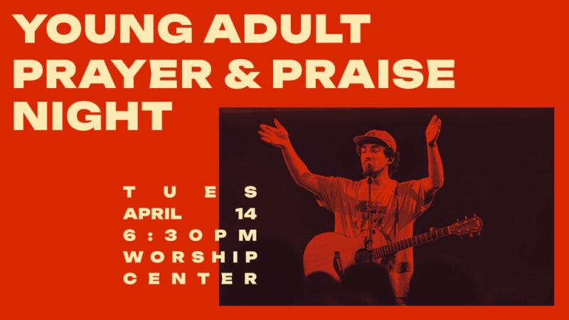 Join us for Young Adults Praise & Prayer Night on Tuesday, April 14, from 6:30–8:00 p.m. in the Worship Center. We’ll gather for an unhurried evening of worship, Scripture, and prayer as we seek the Lord together and lift up our campus, city, and generation. Come expectant and invite a friend to join you.